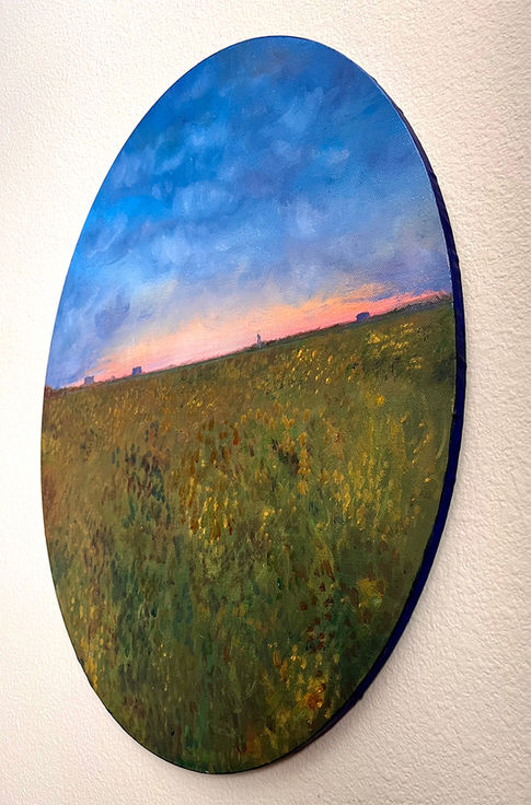 This piece captures a moment of complete oblivion, where the sunset and landscape seem to wash over the viewer, unaware or concerned. There is a sense of being enveloped in the simple joy of ignorance, where one is so disconnected from the complexities of the world that they can fully embrace the bliss of the present moment, unbothered and at peace. Exhibited at RTown Gallery during the "Yeehaw" Art Show in June 2024.