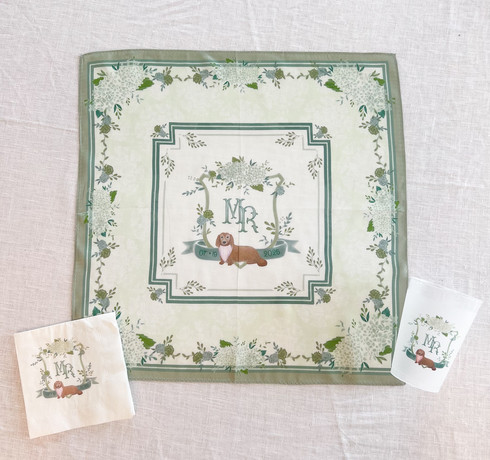 Honey, the dog, joins the couple’s wedding crest in this collaborative piece with designer Brennan. Her florals, monogram, and crest provide the elegant framework, while Honey adds warmth, charm, and a touch of playful personality to the watercolor duogram.